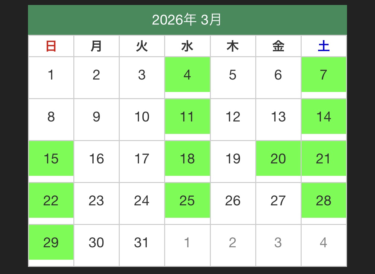 基本的に水・土・日・祝日がオープン日です。その他の日程でもフリー走行は5名以上、または車両レンタルやスクールであれば走行可能な場合もございます。