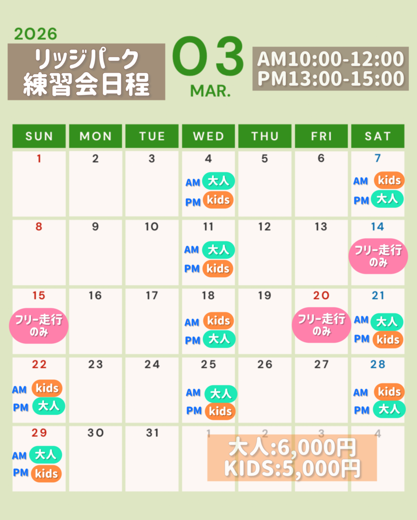| Kids練習会(走行料金込み10:00~12:00/13:00~15:00 2部制) | ¥5,000- |